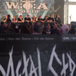 (Vera + Daniel) Der Tag beginnt bereits 11 Uhr mit Equilibrium und wir staunen nicht schlecht, wie viele Festivalbesucher sich vor der Faster Stage einfinden. Sänger Robse ist ebenfalls sichtlich überrascht und knallt einen Klassiker nach dem nächsten ins Publikum. Ein rundum gelungener Gig zur Mittagsstunde. 11:55 Uhr wechseln wir zur Headbangers Stage im großen Wacken Zelt, wo sich Downfall of Gaia einfinden. Wie immer kommt hier Post-Metal der Extraklasse von der Bühne – technisch sehr hohes Niveau und ein wirklich sehr guter Gig. Danach schauen wir zur Hälfte Eluveitie aus der Schweiz zur Hälfte an und wechseln danach zu den Spaßgöttern von Gloryhammer – dem Alestorm Nebenprojekt. Schon von Weitem sieht man in die Höhe ragende Luftschwerter und ein mitgröllendes und tanzendes Publikum – wie immer eine besondere Atmosphäre. Das Konzert wird leider durch eine Unwetterwarnung kurz vorm Ende unterbrochen und das Infield evakuiert. Wir nutzen die Zeit für einen Besuch bei unseren Freunden vom Rock am Stück und treffen uns danach zum Interview mit Hämatom Gitarrist OST im Pressezelt.