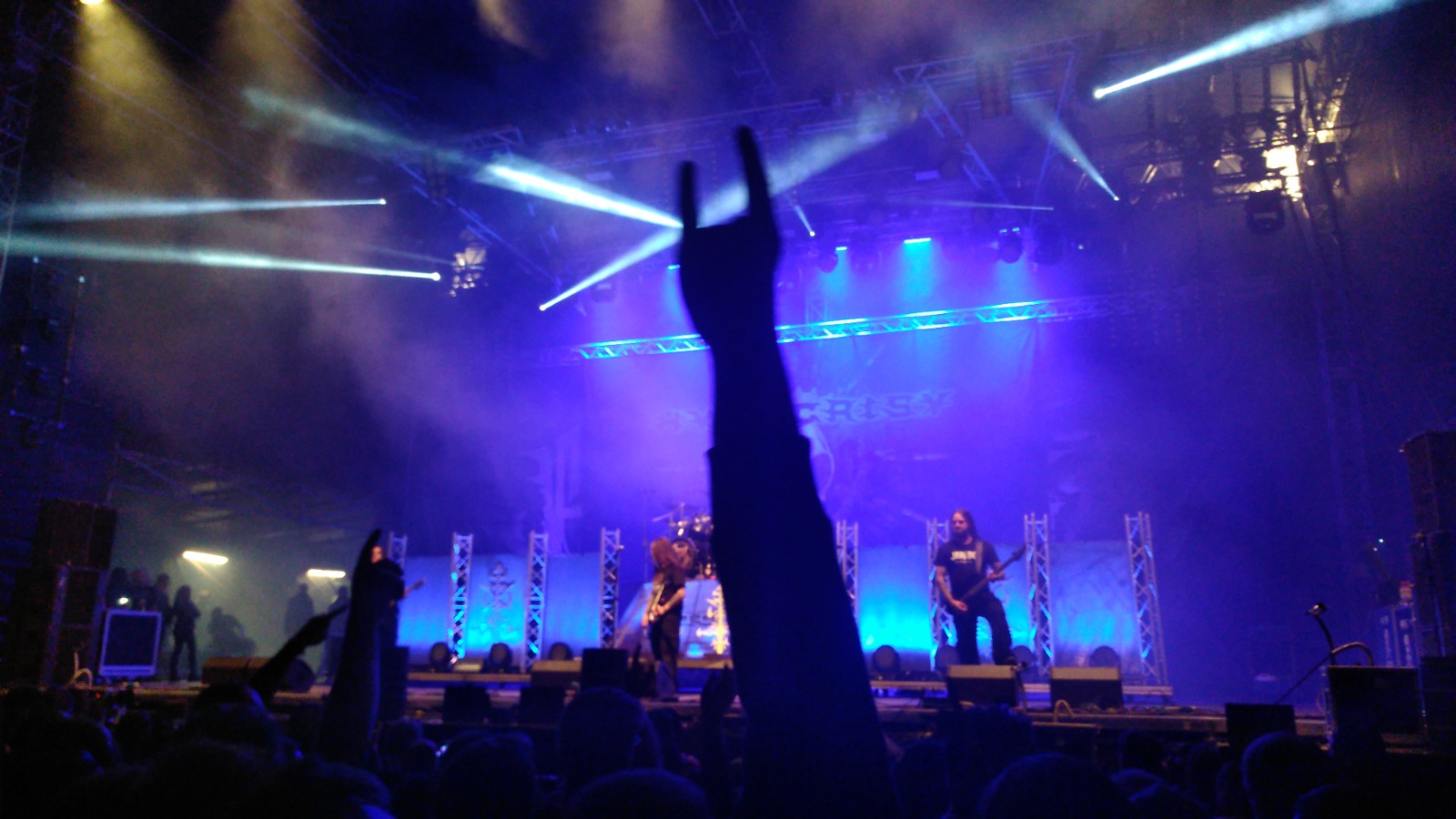 Am Freitagabend geht es vor der Faster-Stage mit dem von vielen erwartetenden Gig von Demons and Wizards weiter. Was Jon Schaffer und Hansi Kürsch hier auf der Bühne abfackeln, lässt sich kaum in Worte fassen. Ein tolles Set gepaart mit Iced Earth und Blind Guardian Klassikern, eine enorme Spielfreude der Band und ein stimmlich brillianter Hansi machen dieses Konzert zu einem der Highlights auf Wacken. Slayer spielt anschließlich den letzten Festival-Gig in Deutschland und die Stimmung im Publikum ist ausgelassen bis traurig. Die Bühnenshow besticht durch viele Flammen, dem klassischen Slayer Design und einem wilden Auftakt. Der Gig verliert zur Mitte etwas an Fahrt, aber dann reiht sich ein Klassiker an den nächsten und lässt zahlreiche Circle- und Moshpits im Publikum entfachen. Zum Ende sieht man 4 traurige Musiker, die sich mit Händeklatschen bei den Fans verabschieden. Allerdings sagt Tom Araya „Auf Wiedersehen!“ bevor er die Bühne verlässt – vielleicht ein versteckter Hinweis? Mit Opeth folgt ein technisch sehr hochwertiger Gig, der jedoch nicht für die breite Masse interessant ist. Dies macht sich auch vor der Bühne deutlich. Hämatom beenden anschließend den Freitagabend und liefern das, was die Fans von der Deutschrock Band gewohnt sind. Für 2 Uhr nachts ist noch jede Menge vor der Bühne los und man merkt den feiernden Fans keinerlei Müdigkeit an. Hits wie „Eva“ (mit Drumsolo Stagediving Einlage) oder „Alte Liebe rostet nicht“ werden ausgiebig gefeiert. Ein gelungener Abschluss von Tag Nummer drei.